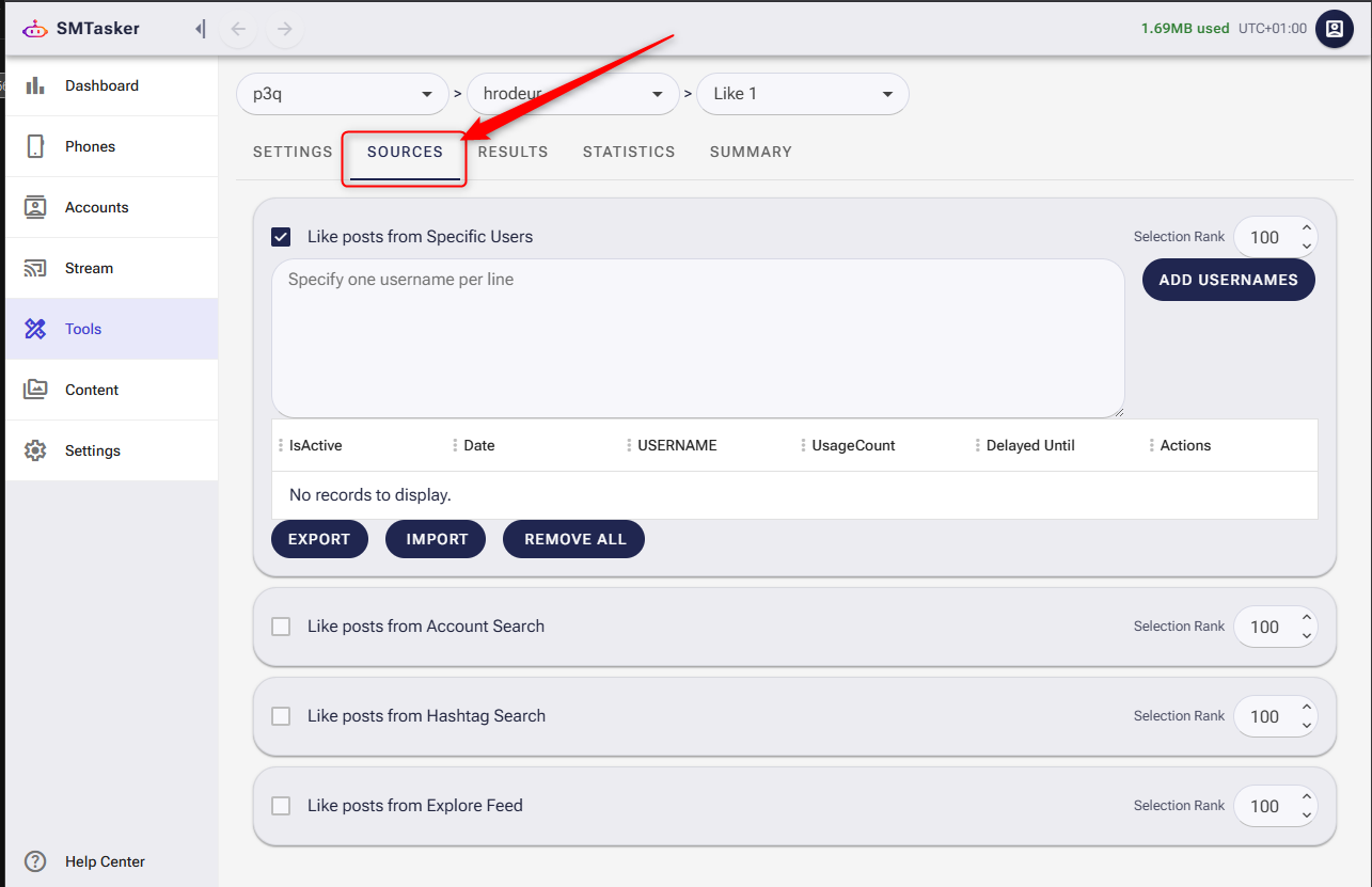 Now click the SOURCES tab. This is where you tell the tool where to find users to interact with.