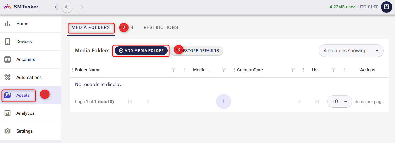 In your SM Tasker dashboard, click Assets in the left sidebar. Then click the MEDIA FOLDERS tab at the top.